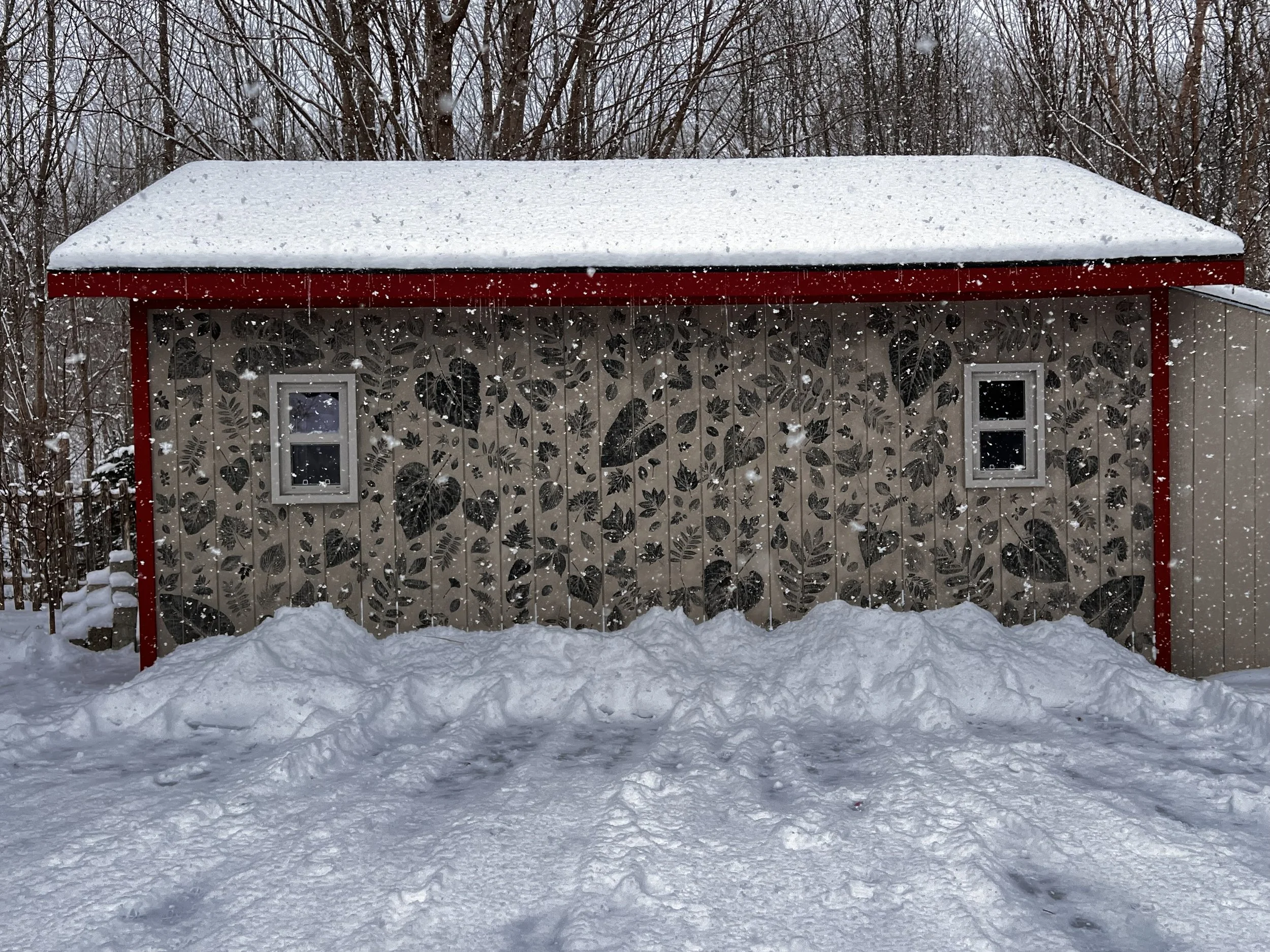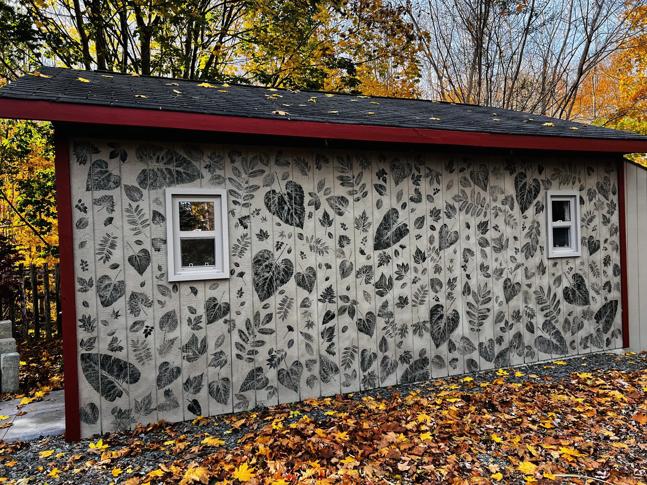 The process itself was straightforward and intentionally simple. Each leaf was inked individually and pressed directly onto the wall by hand. There was no baren —just steady pressure, responsiveness, and a willingness to accept variation. The wood siding added its own texture, catching ink unevenly in places, which I came to see as part of the collaboration. Some impressions are crisp and bold; others are faint, partial, or broken. Together, they form a rhythm rather than a uniform pattern.